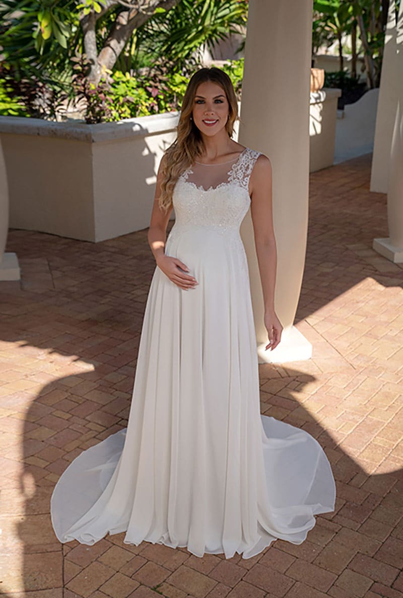 Verzaubern Sie im schlichten Stil dieses weißen Chiffon-Brautkleids, das durch den Illusionsausschnitt mit zarter Spitzenapplikation eine elegante Note erhält. Ein fließender Rock mit zarter Schleppe rundet das traumhafte Design ab.