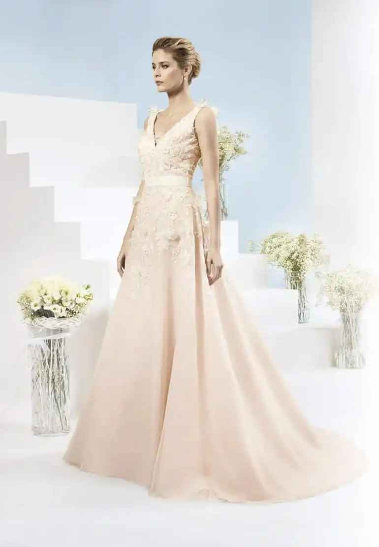 Zauberhaftes A-Linie Brautkleid in einem sanften Blush-Ton, gekennzeichnet durch einen tiefen V-Ausschnitt und zarte Spitzenapplikationen. Dieses traumhafte Design verbindet klassische Eleganz mit einem Hauch von Romantik.