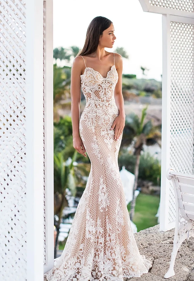 Verführerisches Meerjungfrauen Brautkleid in einem eleganten Nude-Ton, akzentuiert durch aufwendige Spitze. Das tief geschnittene Herzausschnitt-Dekolleté unterstreicht die feminine Silhouette und verleiht einen Hauch von Glamour. Ideal für eine moderne Märchenhochzeit.
