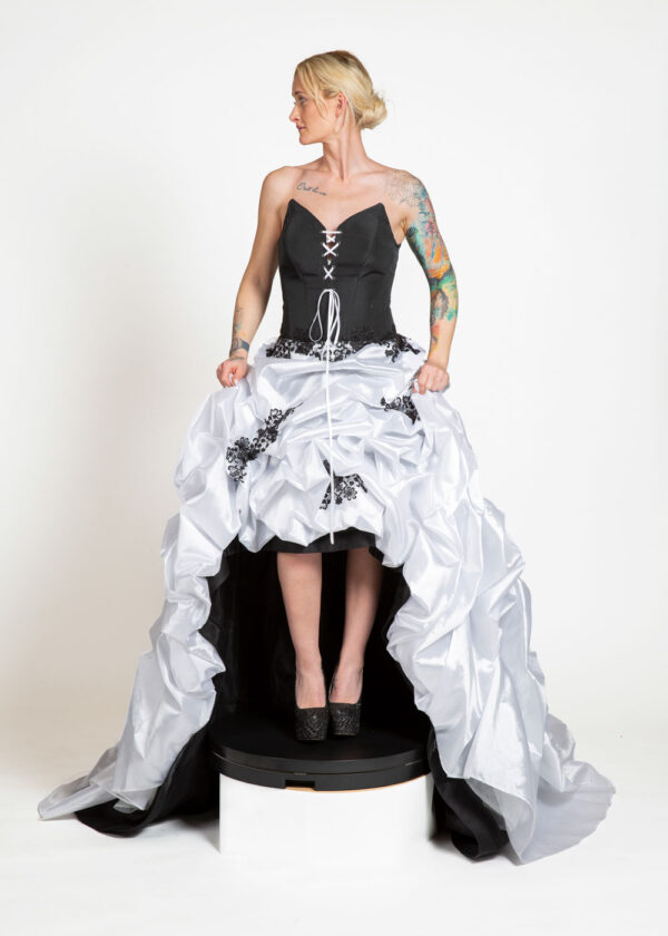 Das Brautkleid „Yasmin“ im Vokuhila-Stil ist ein atemberaubendes Modell für die anspruchsvolle Braut. Das Kleid ist aus hochwertigem Taft gefertigt und verfügt über eine lange Corsage mit einem eleganten V-Dekolleté. Der Rock ist trägerlos und mit gerafftem Stoff und edlen Spitzenelementen verziert. Diese aufwendigen Details schaffen eine harmonische Verbindung zwischen traditioneller Eleganz und modernem Design. Die Schürung auf der Rückseite ermöglicht eine perfekte Passform des Kleides, während die lange Schleppe für eine atemberaubende Silhouette sorgt. Der Vokuhila-Schnitt des Rocks gibt dem Kleid einen spielerischen Touch und betont die Schönheit der Braut. Das Brautkleid „Yasmin“ ist in den klassischen Farben Schwarz-Weiß gehalten und bietet somit eine besondere Alternative zu traditionellen Brautkleidern. Das Kleid ist eine perfekte Wahl für die Braut, die ein unvergessliches und unkonventionelles Outfit für ihren großen Tag sucht.