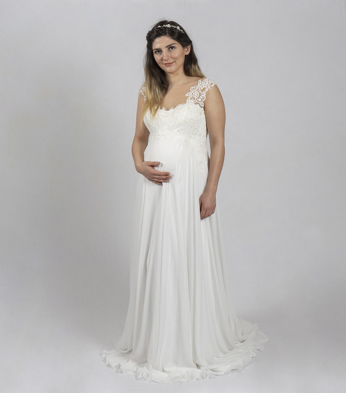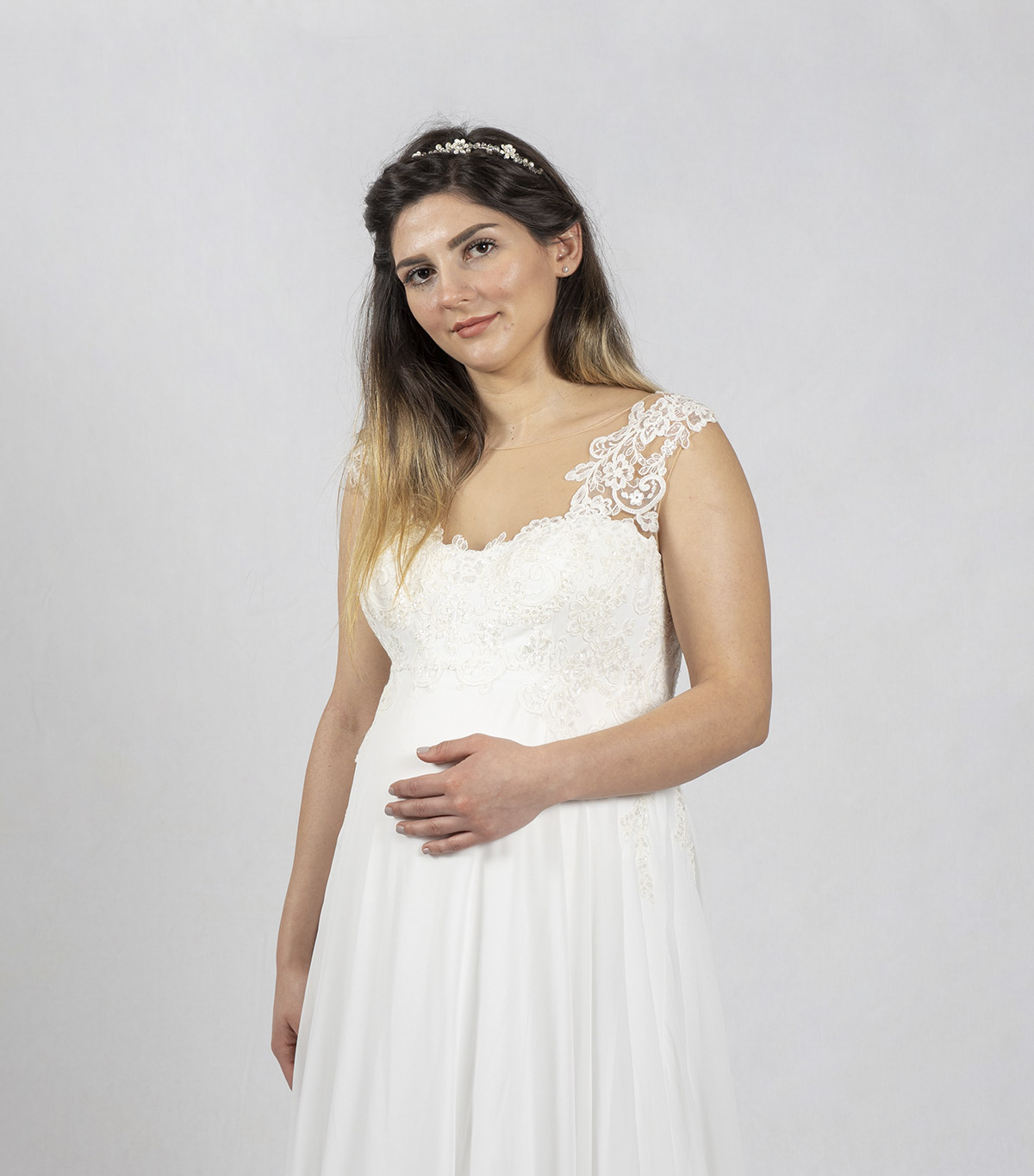 Der Rückenteil wurde aus Tattoo Spitze gefertigt und ist ein echter Hingucker. Der Rock aus Chiffon fällt schmeichelhaft über Ihren Babybauch und verhüllt ihn gleichzeitig schützend. Die edle Schleppe komplettiert dieses Märchenkleid.